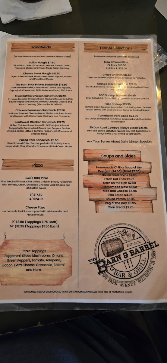 The Barn & Barrel Bar and Grill Menu